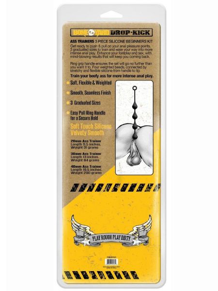 The Boneyard Drop-Kick Silicone 3-Piece ass trainer is the perfect beginners kit for anal kinksters. Get ready to push & pull on your anal pleasure points. The kit comes with 3 graduated sizes to train and ease your way into more intense anal play. Enhance your foreplay and sex with mind blowing results that will keep you cumming back for more. The ring grip handle ensures the set will go no further than you want it to. Four weighted beads connected by stretchy and flexible silicone from handle to tip. Absolutely no filler.
