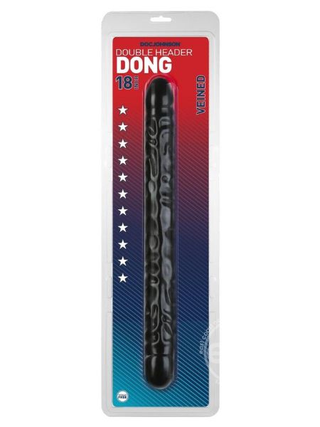 Get ready for a double dose of fun. Doc Johnson's 18 inch Double Header Dong has a realistic head on each end and a bulging veined shaft for exciting sensations. The dong is flexible for solo play and long enough for partner penetration. Made of latex-free phthalate-free PVC. Available in White and Black. Proudly Made in America.